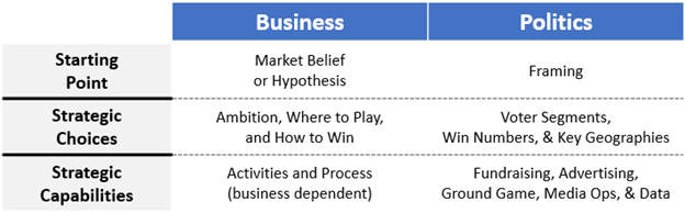 Therefore, your translation from business to political campaign strategy will look like this: