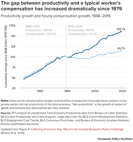 A study has shown that minimum wage, which is $7.25/hour today, would be $26 per hour if it had been changed to keep up with productivity.[9]