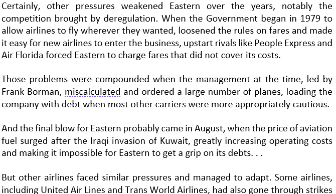 Industry consolidation after deregulation, oversubscribed on planes, increasing debt, increase in fuel prices, self-dealing leadership, and dropping consumer confidence seems like a lot of strategic issues to deal with. Just to put some timing on it, Eastern’s problems started with deregulation in 1979, the self-dealing leadership took over in 1986, and the strike began in early 1989, which was 5 years after major union concessions to keep the business going. Seems like un-caring and allegedly corrupt leadership took over a struggling business and proceeded to strip it in favor of other parts of their portfolio. How would this anecdote change my initial conclusion? Like I said, unions could only be bad if you are strategically weak, and Eastern Airlines was weak well before its labor relations deteriorated.