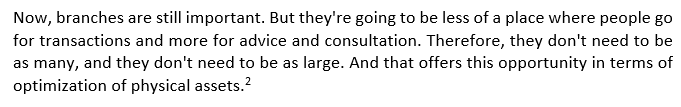 The café provides human resources to facilitate more complex financial conversations and customer service. Furthermore, by creating a consistent touch point at the café, Capital One positions itself to be there as latent consumer needs become urgent. For context: That business plan you've been working on at the café for the past 6 months? Simply get up from the high-top table and talk to a loan officer on the couch. Additionally, cafés are brand marketing that grant interactive access to consumers at the bank. Somewhat surprisingly, this is actually an excellent plan to take advantage of the overall branch decline. Especially, assuming they spent $2M per cafe, their costs were approximately $100M,[14] over the last 7 years for rollout. Meaning it was around .3% of last year’s net revenue.[15]
