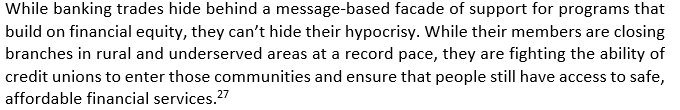 At that point, Congress and regulatory agencies must be ready to step in and assist these neighborhoods. Programs to pilot basic banking at postal services are underway.[23] This will solve some problems by providing a safe alternative to predatory financial services. However, it is facing Republican opposition, leaving the future of this program unclear.[24] Rep. Maxine Waters has introduced legislation that would allow credit unions to serve banking deserts.[25] However, this is opposed by the American Bankers Association.[26] But as B. Dan Berger, the president and CEO of the National Association of Federally-Insured Credit Unions, points out: